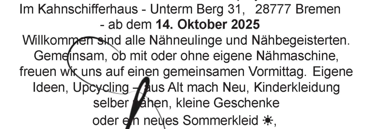 Es können eigene Ideen umgesetzt werden, Upcycling – aus Alt mach Neu – ist ein Thema, Kinderkleidung, kleine Geschenke oder ein neues Sommerkleid können mit etwas Unterstützung gefertigt werden. Neben dem gemeinsamen Nähen soll jeweils auch der Erfahrungsaustausch nicht zu kurz kommen.