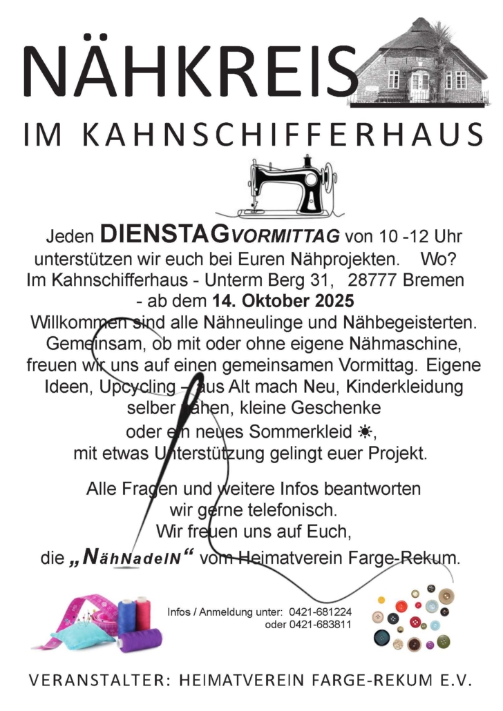 Gewerkelt wird dann im historischen Kahnschifferhaus, Unterm Berg 31. Willkommen dazu sind nicht nur diejenigen, die gerne nähen, sondern auch Neulinge, die sich daran versuchen möchten.